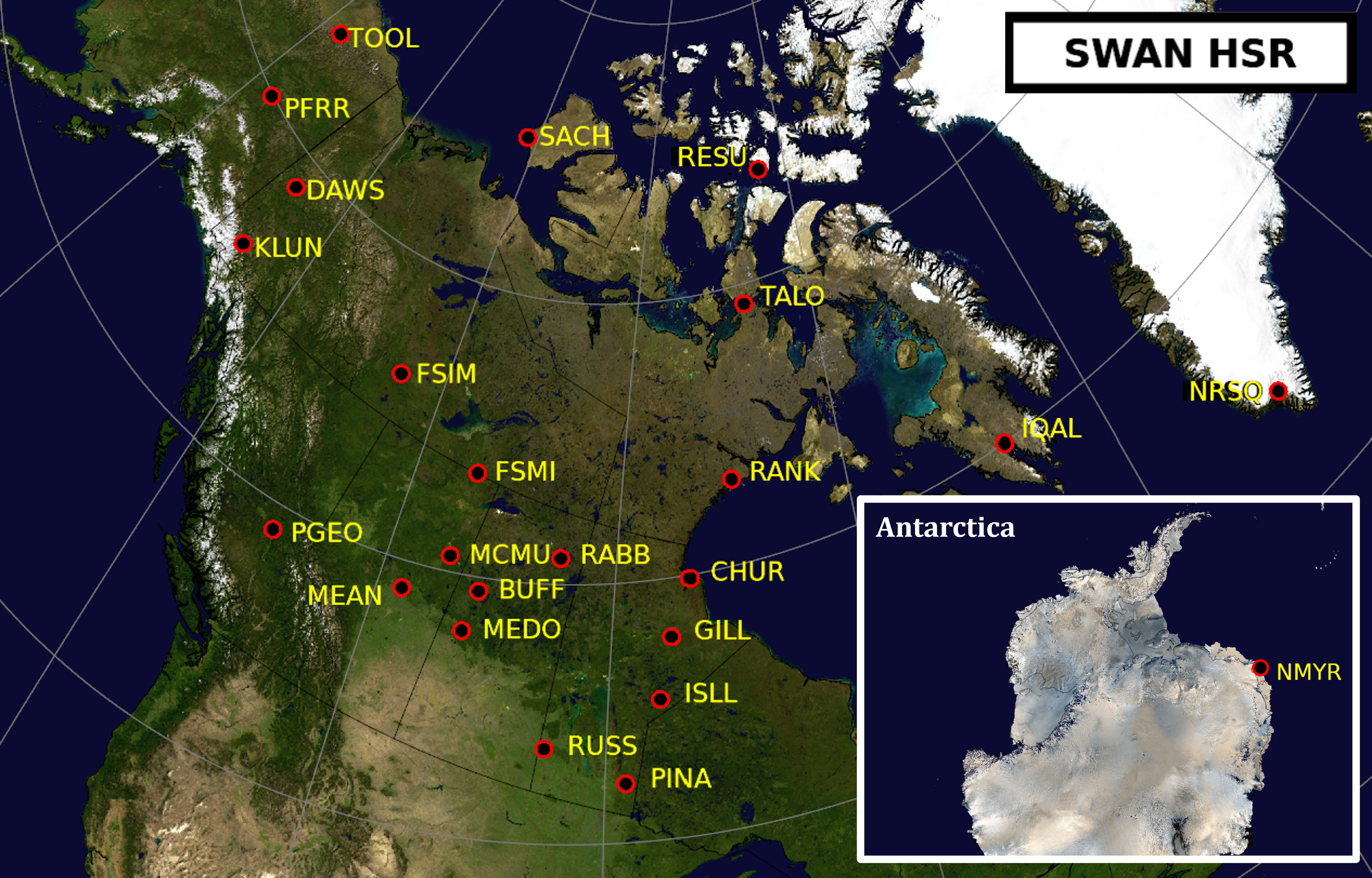 The Hyper Spectral Riometers (HSRs) are newer systems developed as part of the Canada Foundation for Innovation, Space Weather Adaptive Network (SWAN) project. SWAN HSR systems are multi-frequency, single beam riometers, which are replacing the aging La Jolla single frequency systems. Deployments are still ongoing, with the remaining systems being deployed before end of 2025.